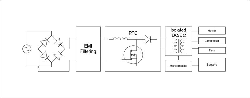 Let us consider the Heating Ventilation and Cooling (HVAC) system, which takes power from the AC mains, converts that to DC, then converts that DC voltage to different supply rails for powering the fan motors, compressor, heating coils, microcontroller, and other supporting digital circuitry. To improve efficiency, a PFC (Power Factor Correction) circuit is likely to be included so that the AC load current and Voltage are in sync. A microcontroller or set of microcontrollers act as the brains for directing how the compressor, fans, and heating coils operate and will monitor feedback on whether corrective actions need to be taken.
