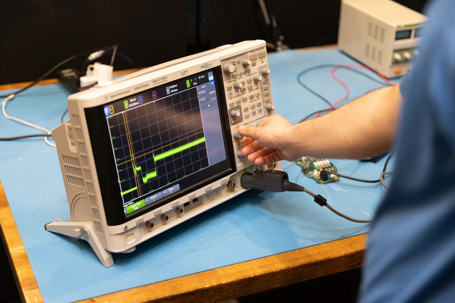 Another oscilloscope accessory to consider is the current probe. Current probes can provide key high-level insights into system operation. If you see a surge in current, that can indicate state changes, fault events, as well as possible sources of EMI. In the figure below, the yellow trace corresponds to the input current. Here we see a large transient ripple at power on, which generated EMI events that periodically caused issues for one of the microcontrollers.