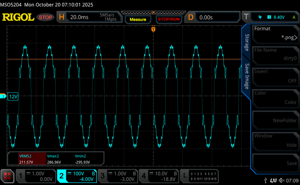 For large power hungry appliances in the United States, the nominal input is expected to be 208 VAC yet these units are often designed to accommodate a ±10% tolerance ranging from 187VAC to 230VAC. To further complicate things, the AC source may not be clean and may introduce various harmonics and transients into the system unrelated to the fundamental. These harmonics might be from local industrial activity, smart meters, utility switching operations, and lightning strikes. A programmable AC supply is useful for determining how robust the system is and whether it will survive various corner cases. Ideally your AC supply should allow you to modify the amplitude of your fundamental AC power, modify the frequency of the fundamental, and give you the ability to inject other harmonics. In our latest project, our client had random spontaneous dropouts in their system that tended to occur in certain test rooms at certain times of the day and were otherwise difficult to duplicate. By using a Chroma 61504 with the aforementioned features we were able to construct a dirty supply signal that reproduced failure rather consistently in under two minutes, which naturally allows more rapid feedback for root cause analysis. Below is an example of what we were able to supply our system under test to more rapidly reproduce failures.