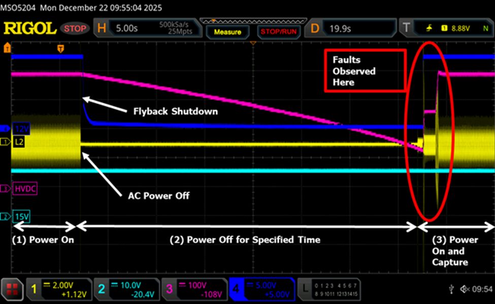 At some point in your debugging, you may realize that a very specific series of events need to occur to crash your system and even then it does not happen every single time. One of our clients had an issue where a specific off duration spanning tens of seconds during multiple power cycles would exhibit the microcontroller getting stuck and ultimately the system crashing. As the failure rate was about 3% of the power cycles, you can imagine that hours of attempts had to pass before accumulating enough faults to start formulating a meaningful hypothesis and possible corrective actions. As such, you could deduce that the unfortunate engineer attempting to do these tests manually might burn-out and get gradually sloppier with each cycle. Consequently, we put together a python script to automate the task. Subsequently, that script churned through thousands of power cycles through the day and into the night and ultimately delivered a payload of useful debug information to process after we enjoyed our morning coffee the following day. The illustration below illustrates the kind cyclical conditions we were able to generate and test with our automation script: