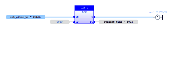 Note below that var1 is not set to true until the TON function is enabled for at least 5 seconds. The TON function is reset so it can be used again by disabling the input IN.